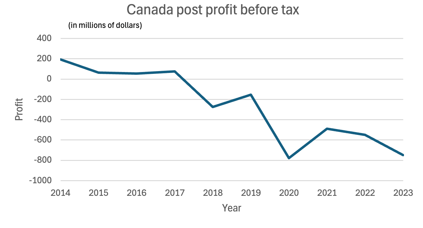 In a 2023 annual report Canada Post reported 3.3 million less letters sent between the years of 2006 and 2023. That equates from a household receiving seven mails a week to two mails a week.